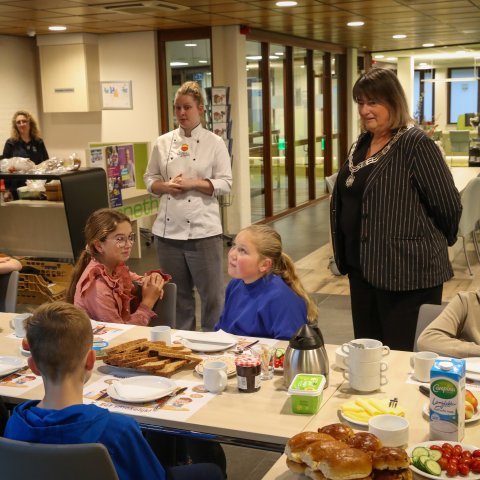 De burgemeester genoot van de leuke gesprekken en heeft iets opgemerkt: “Wat we vandaag veel gezien hebben is kaas met komkommer op brood. Die combinatie is duidelijk favoriet.” Voordat we rond 09.30 uur afsluiten bedankt ze de leerlingen voor hun komst. Maar ze wil wel nog één ding weten: “Wat heb je vandaag gegeten, wat je morgen thuis gaat eten?” Een mooie vraag om over na te denken op de fiets terug naar school.