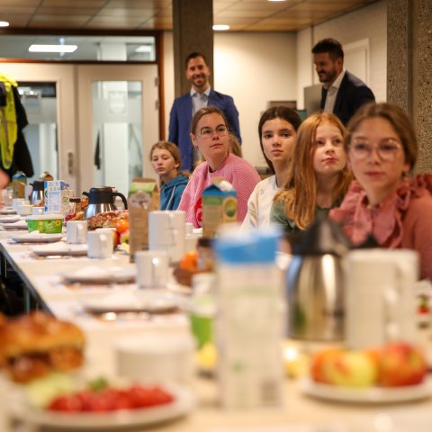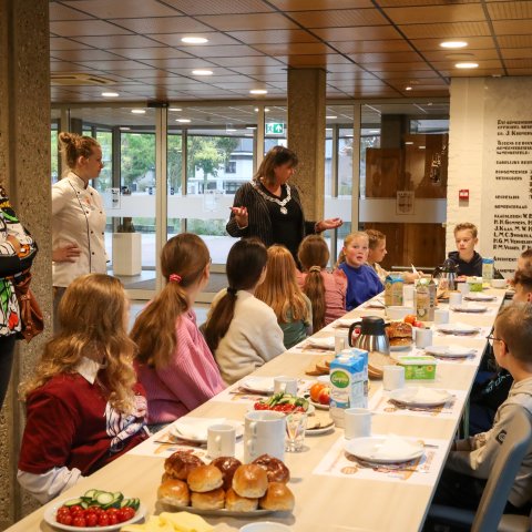 Op 7 oktober was de hal van het gemeentehuis gevuld met ontbijttafels, waarop alles klaarstond voor een gezellig ontbijt. Met onder andere volkoren tarwebolletjes, fruit, yoghurt, kaas, komkommer en cruesli wachtte burgemeester Birgit Op de Laak groep 8-leerlingen van basisschool De Tweesprong op. Zij mochten dit jaar met haar en wethouders Jorik Franssen en Boris Meessen genieten van het Burgemeestersontbijt.