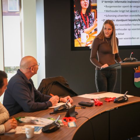 Het laatste half uur sluiten een raadslid en de burgemeester aan. Zij vertellen de leerlingen hoe het er aan toe gaat in de echte gemeenteraadsvergaderingen. Als de leerlingen hen vragen mogen stellen gaan de vingers omhoog: Hoe word je burgemeester? Hebben jullie er nog een baan naast? Is een gemeenteraad in een stad anders dan in een dorp?